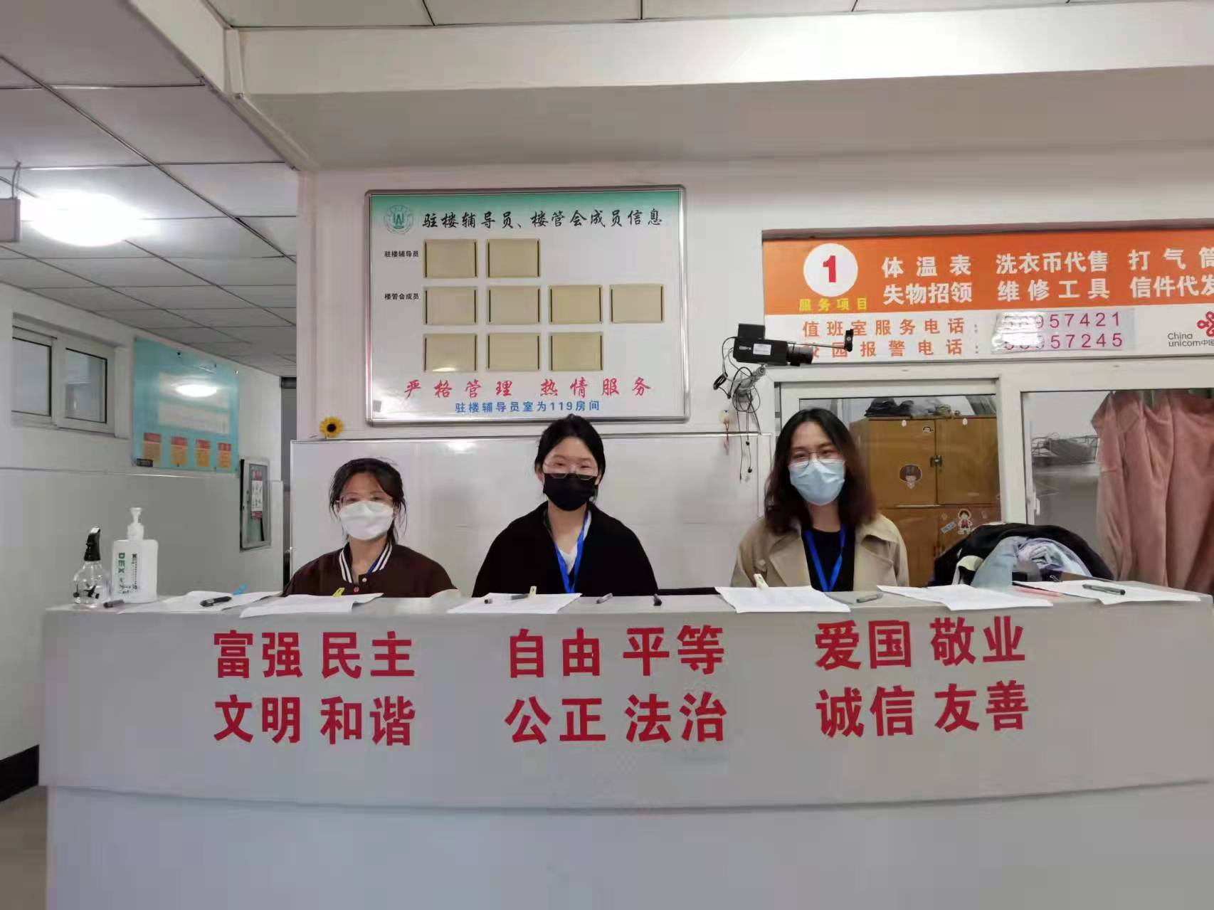员工党员杨阳(右一)在1号宿舍楼参加志愿服务