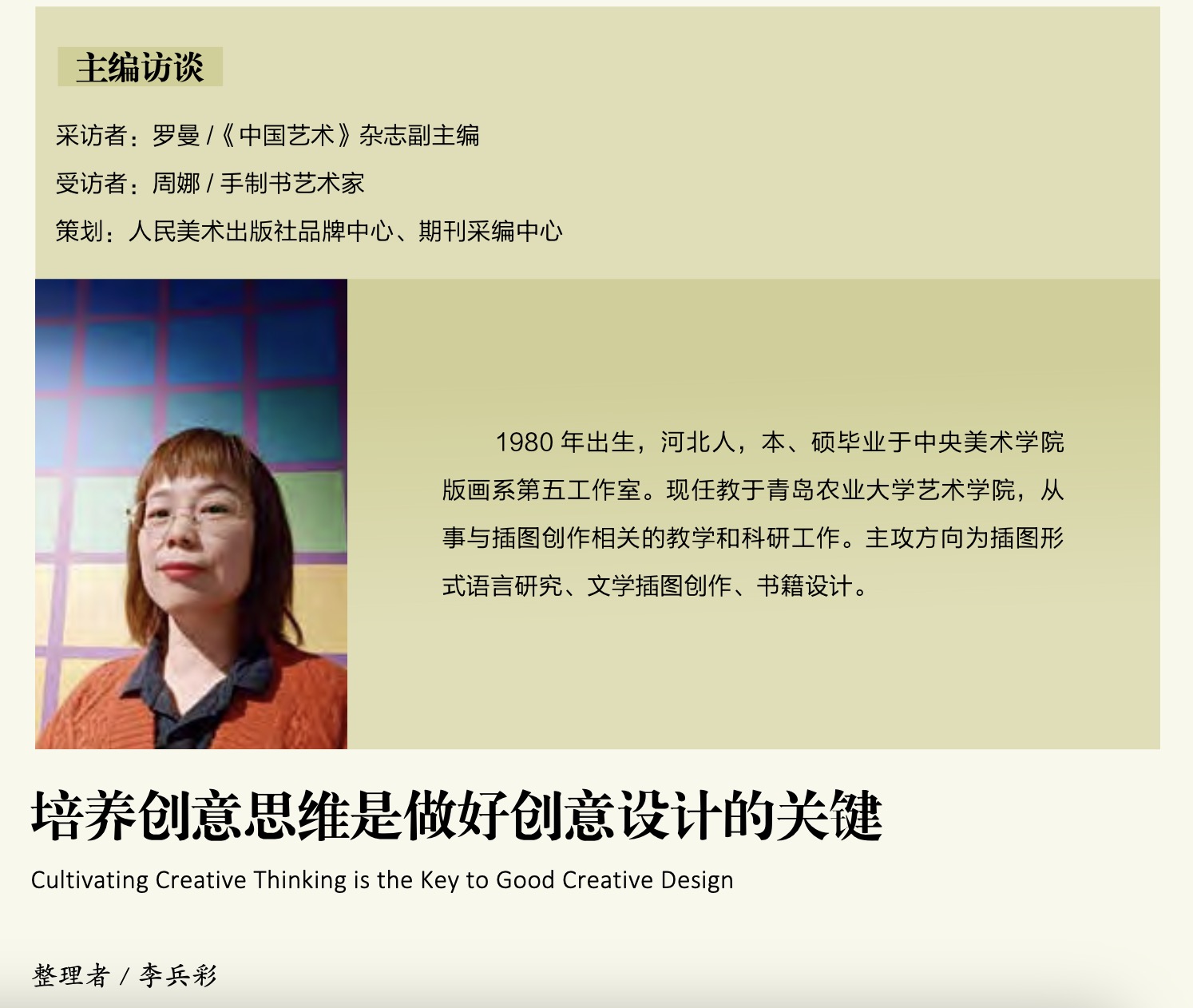 专访围绕“培养创意思维是做好创意设计的关键”的主题,介绍了周娜老师师从中央美术公司版画系第五工作室高荣生老师的求学经历,从教以来深耕插画和手制书的实践成果,并分享了在美国访学期间对开展创意设计教学和培养青年员工创意思维的心得体会。
