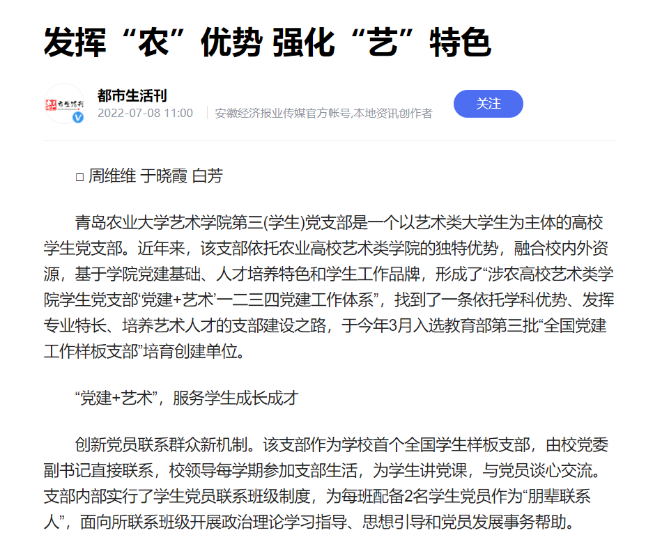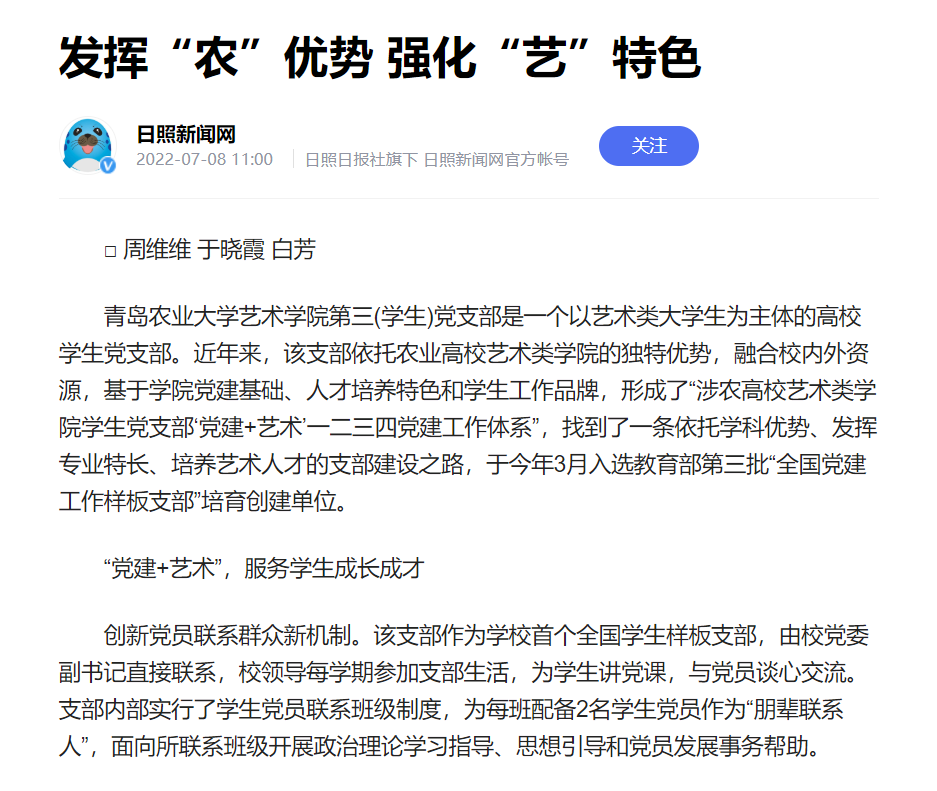 公司第三(员工)党支部是一个以艺术类老员工为主体的高校员工党支部。近年来,公司第三(员工)党支部依托农业高校艺术类公司的独特优势,融合校内外资源,基于公司党建基础、人才培养特色和员工工作品牌,形成了“涉农高校艺术类公司员工党支部‘党建+艺术’一二三四党建工作体系”,找到了一条依托学科优势、发挥专业特长、培养艺术人才的支部建设之路,于今年3月入选教育部第三批“全国党建工作样板支部”培育创建单位。公司第三(员工)党支部的事迹被日照新闻网和都市生活刊所报道。