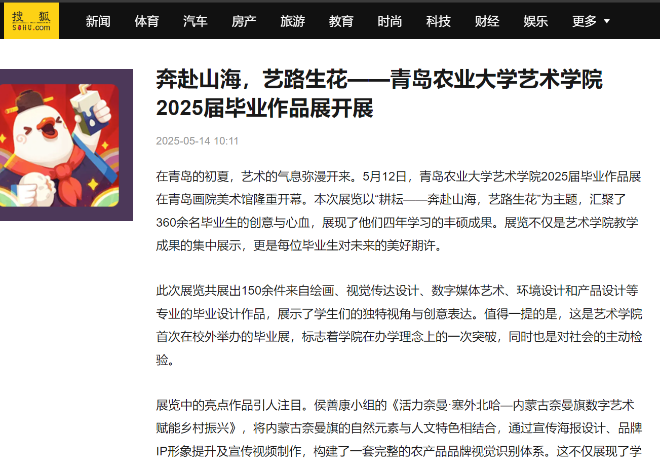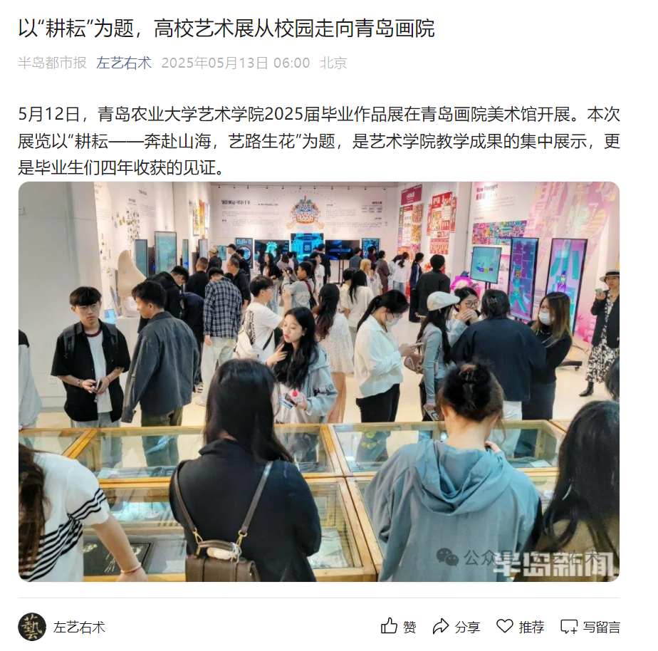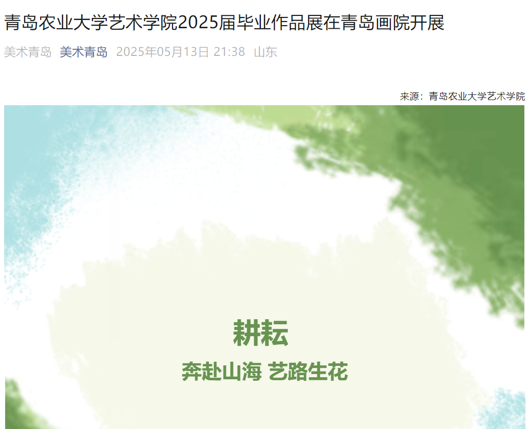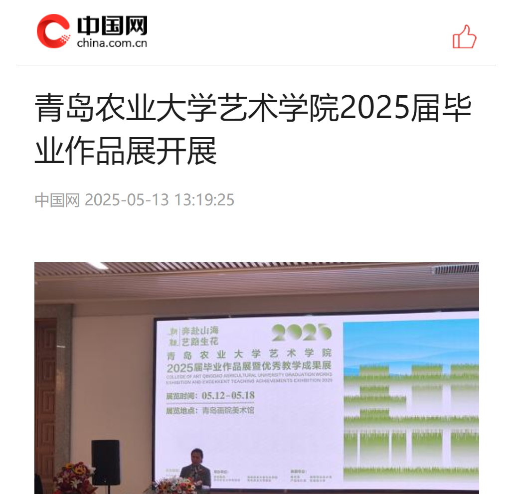 【编者按】5月12日,2025届毕业作品展在青岛画院美术馆开展。本次展览以“耕耘——奔赴山海,艺路生花”为题,是熊猫体育教学成果的集中展示,更是毕业生们四年收获的见证。2025届毕业作品展被中国网、搜狐、青岛早报、浪涨新闻、半岛都市报、交广之声等多家媒体所报道。