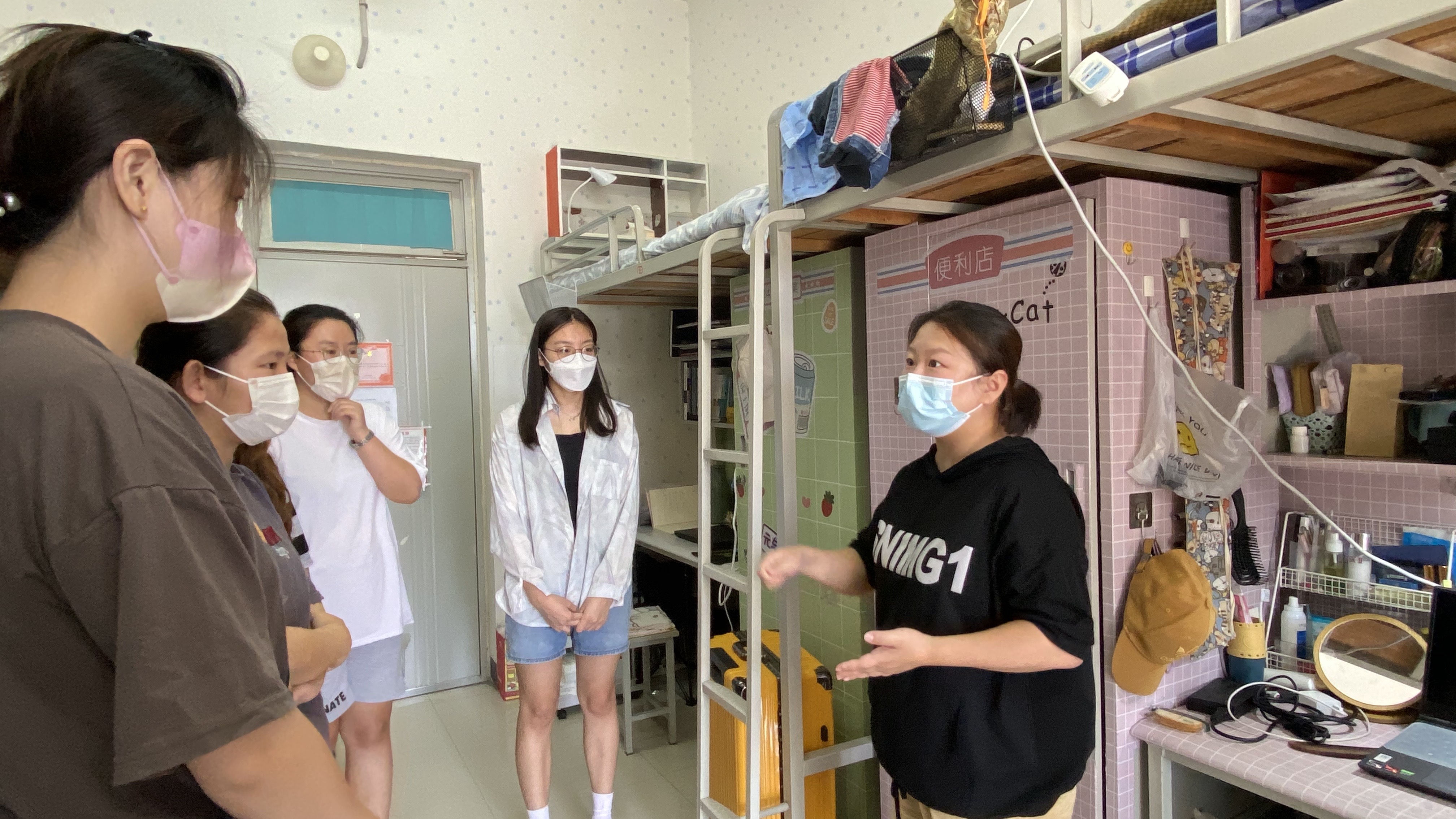 本次应急演练模拟了宿舍一名员工发热的应急处置场景。同舍成员用宿舍配备的体温计测量体温,确认发热状况后立即启动校园应急响应,第一时间全员静止,迅速向校医院及辅导员老师报备。医护人员上门将病员隔离转运至集中隔离点隔离,同舍其余员工严格落实就地隔离,等待医护人员及后勤保障人员上门进行核酸检测、流调溯源及环境消杀。此外,辅导员老师进行疫情防控专题宣教,就为何要落实“戴口罩、勤通风、一米线”等防控措施进行详细讲解,引导同学们理解每日体温上报、接种新冠肺炎疫苗的重要性和必要性。