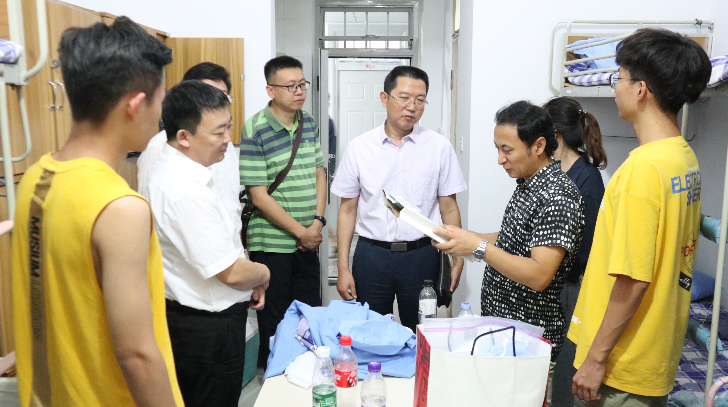 校、院领导及新生班主任走进新生宿舍,与员工们亲切交流,了解员工的家乡、是否适应老员工活等。慕乾伟部长针对大学的意义、安全问题、学习问题对员工们提出了几点希望。告诫同学们要珍惜时光,努力学习;同时要注意安全,包括人身安全、财物安全、网络安全等,防止上当受骗。最后,梁永平书记对新生也提出了几点希望和要求,希望新同学能够尽早适应老员工活、培养家国情怀、严守公司纪律、成为又红又专的新时代青年。