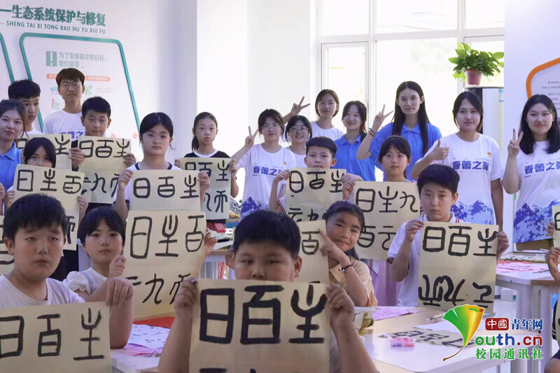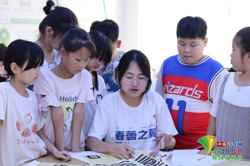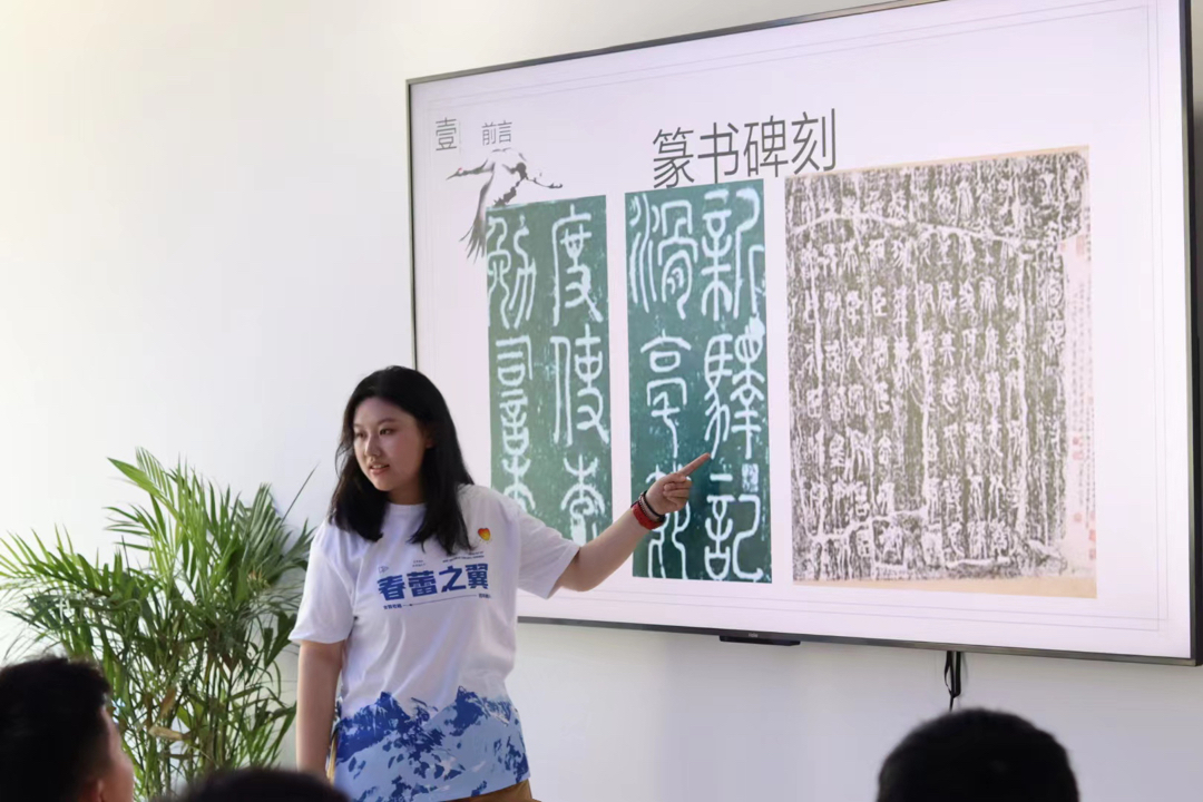 熊猫体育志愿者丁梦带领同学们认识篆书。图片转载于中国青年网