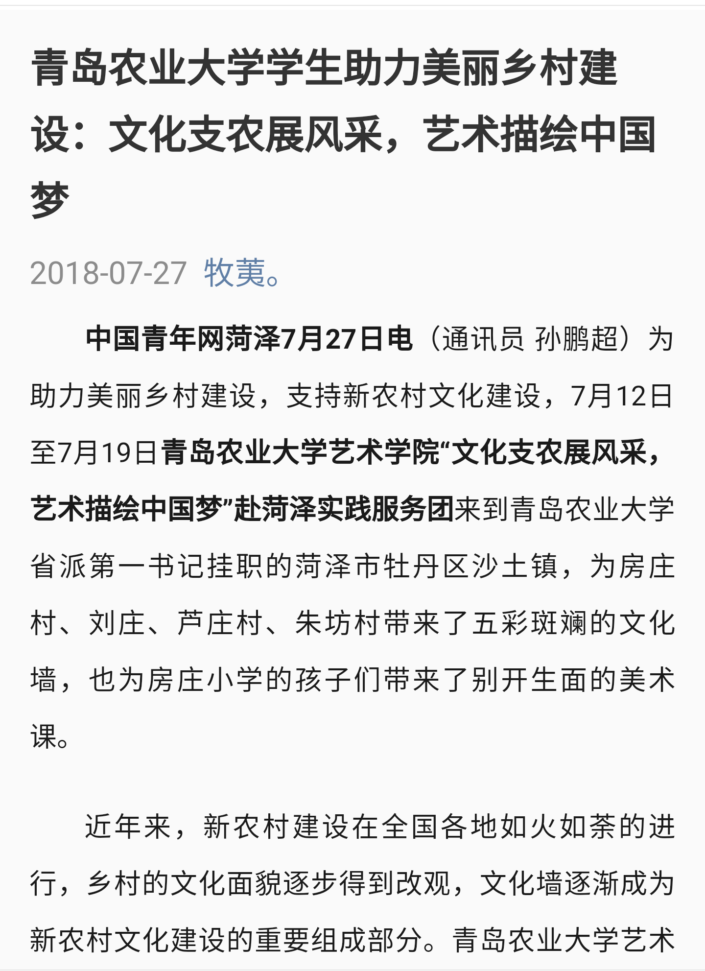 中国青年网菏泽7月27日电(通讯员 孙鹏超)为助力美丽乡村建设,支持新农村文化建设,7月12日至7月19日熊猫体育“文化支农展风采,艺术描绘中国梦”赴菏泽实践服务团来到熊猫体育省派第一书记挂职的菏泽市牡丹区沙土镇,为房庄村、刘庄、芦庄村、朱坊村带来了五彩斑斓的文化墙,也为房庄小学的孩子们带来了别开生面的美术课。