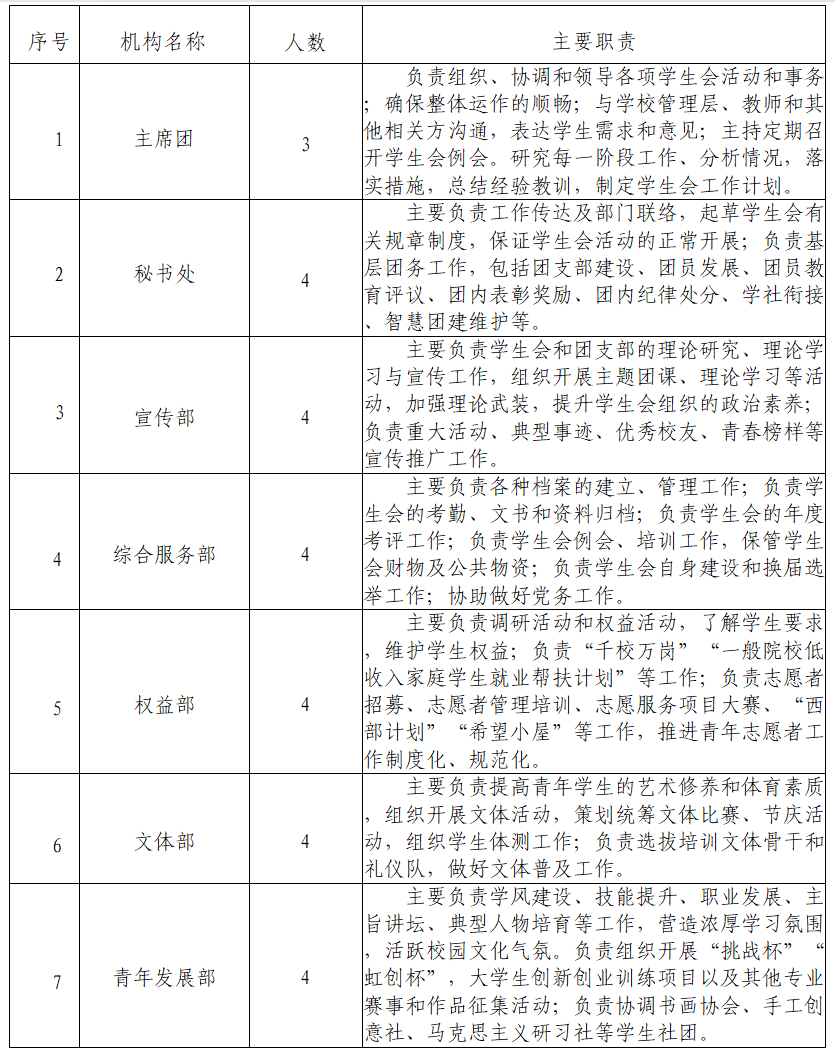 (一)遵循和贯彻党的教育方针,组织同学开展学习、文体、社会实践、志愿服务、创新创业等多种活动,促进同学德智体美劳全面发展,团结和引导同学成为热爱祖国,适应中国特色社会主义事业要求的合格人才,进一步增强对中国特色社会主义的道路自信、理论自信、制度自信、文化自信,自觉树立和践行社会主义核心价值观,为实现中华民族的伟大复兴而努力奋斗;