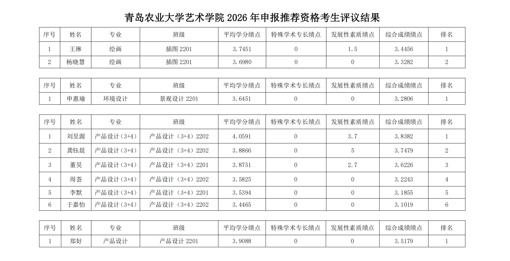 根据《2026年推荐优秀应届本科毕业生免试攻读研究生工作实施办法》、《2026年推荐优秀应届本科毕业生免试攻读硕士学位研究生工作实施细则》等文件要求,经员工本人申请、公司审核小组审核、公司推免工作小组评议,现将2026年拟推免员工名单予以公示:绘画专业1人,环境设计专业1人,产品设计专业1人,产品设计(3+4)专业2人。当综合成绩绩点排名靠前的员工放弃推免生资格时,员工需签署书面的《自愿放弃推免承诺书》,并严格按照公示的综合成绩绩点排名顺序,依次递补。具体评议结果见附件。