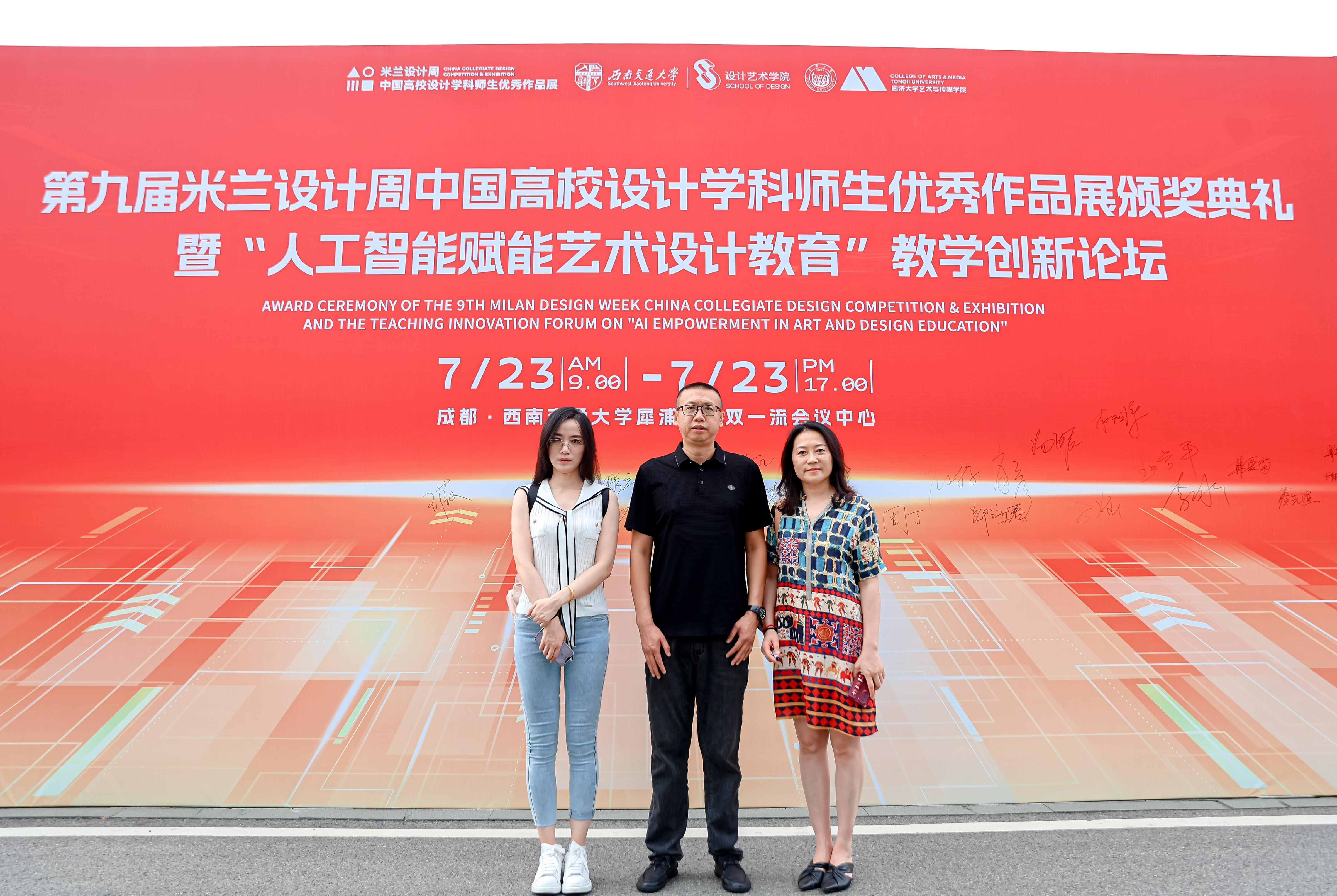 近期,第九届米兰设计周中国高校设计学科师生优秀作品展颁奖典礼暨 “人工智能艺术设计教育” 教学创新论坛在西南交通大学成功举办。公司高度重视此次行业盛会与高水平赛事,由副经理赵紫平带队,产品设计系郑海蓉、李灿老师共同前往参会。